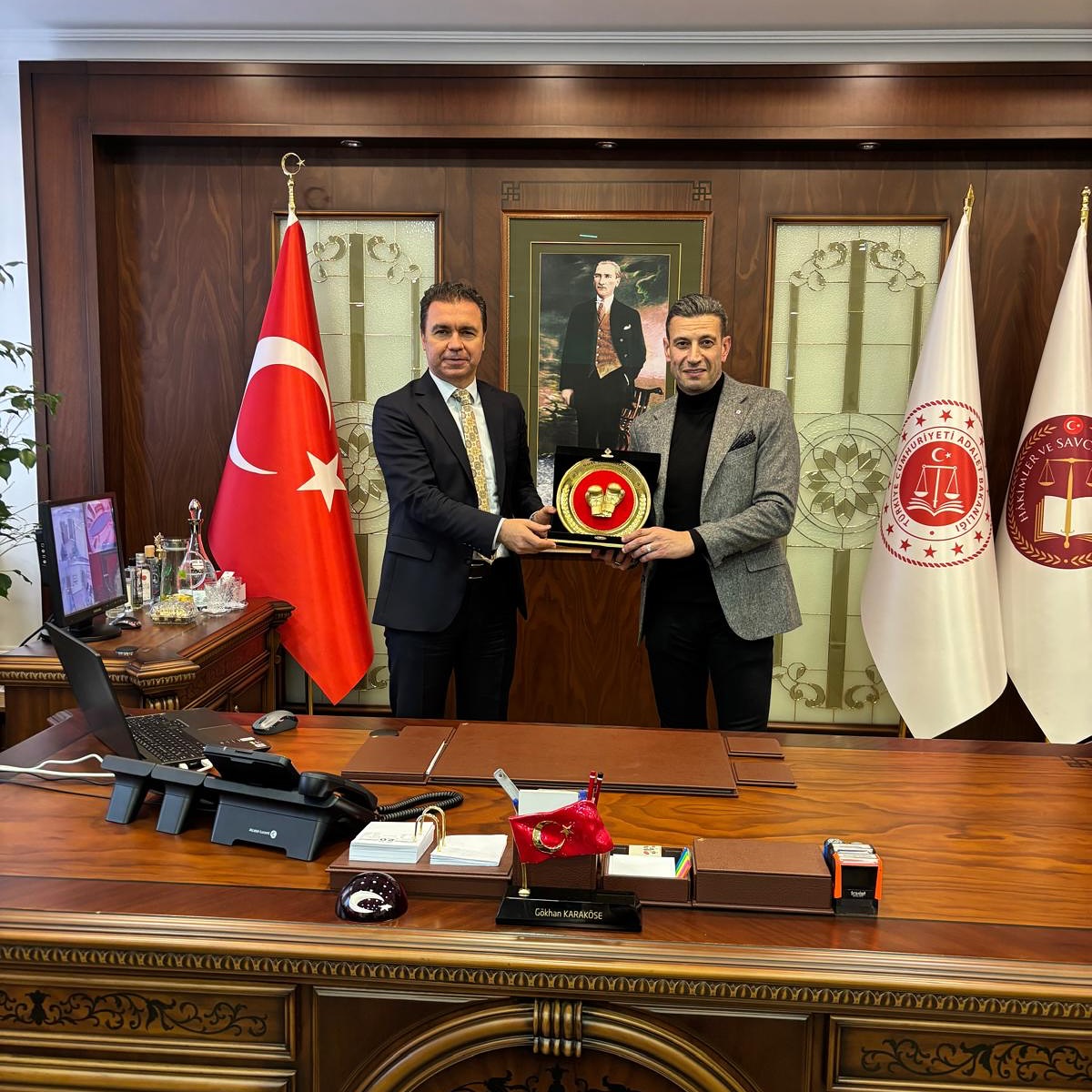 Türkiye Boks Federasyonu Başkanımız Suat Hekimoğlu ile danışmanı Aydın Demir, Dış İlişkiler Kurulu Başkanımız Sinan Demircioğlu, Yıldırım Beyazıt Üniversitesi Hukuk Müşaviri İskender Okan Aras ve iş insanı Abdullah Kaya, Ankara Başsavcısı Gökhan Karaköse ve Başsavcı Vekili Murat Özcan’ı makamında ziyaret etti. Türk Boksunun gelişimi üzerine keyifli bir sohbetin gerçekleştiği ziyarette, Başkanımız desteklerinden dolayı Sayın Başsavcımıza teşekkür ederek Türkiye Boks Federasyonu adına bir plaket takdim etti.